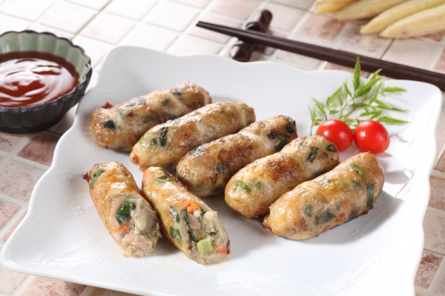蚵卷採用嚴選鮮蚵、黑豬肉、韭菜與洋地瓜,外皮裹上新鮮豬網紗,入口可嚐到滿滿鮮味。