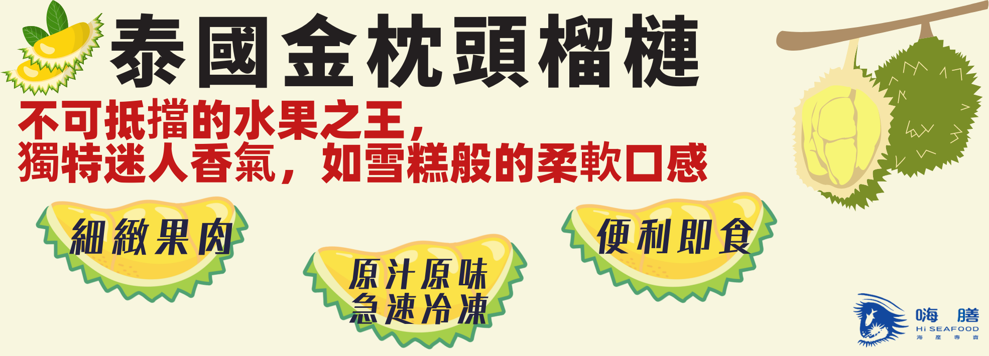 榴槤有著獨特的香味,飽含多種豐富的營養,貴為熱帶水果之王 「金枕頭榴蓮」的果體外型大,淡黃色果肉細緻、香甜不黏手,果核扁小肉厚,氣味不會很重,因為外觀看起來就想金色枕頭般,故名為金枕頭榴槤,是最受歡迎的品種喔!